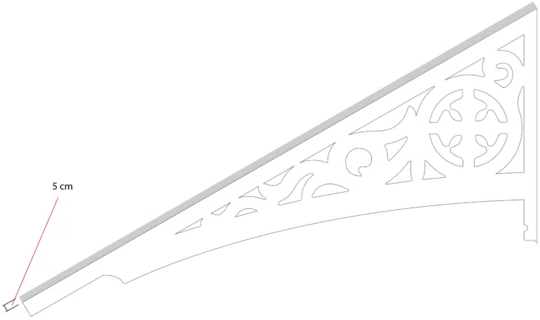 Für eine einfache Montage Ihrer Windbrett-Verzierungen wird Ihr Dekor mit einer zusätzlichen Höhe von 5 cm (oder entsprechend Ihrer individuellen Vorgaben) hergestellt. Sie haben damit die Möglichkeit, Ihre Windbrett-Verzierungen auf die richtige Länge zuzuschneiden und somit individuell an das Dach anzupassen.
