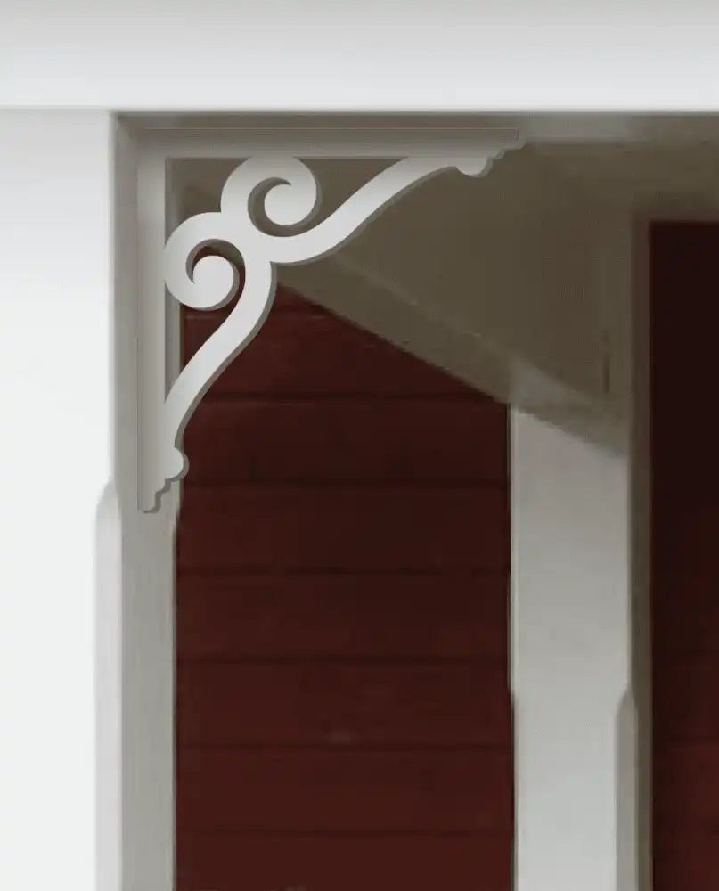 Zierkonsole mit kunstvollen Schnörkeln im Stil klassischer Holzdekoration. Hergestellt in Schweden – perfekt für Veranda, Eingang oder Vordach und verleiht Ihrem Haus historischen Charme und Eleganz.