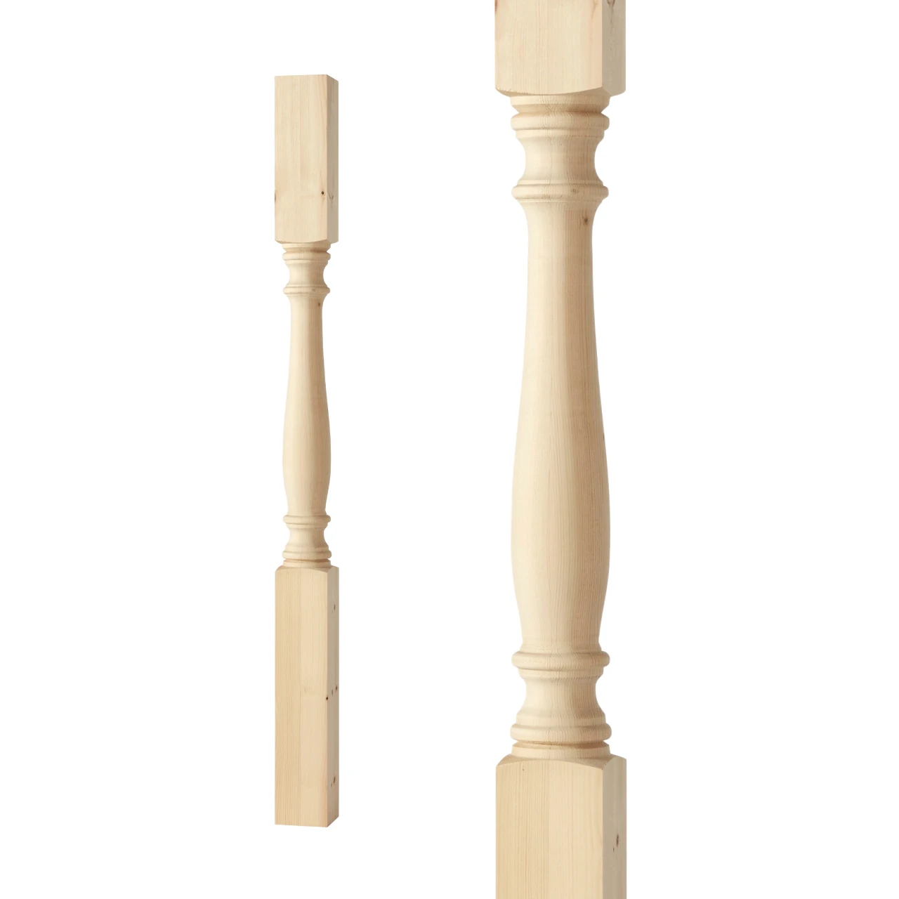 Stolpe i gran, svarvad 1180 x 85 mm. Passar för veranda, balkong och staketräcke. Kombineras med höga pelare, ändknoppar och räckesprofiler i sekelskiftesstil.